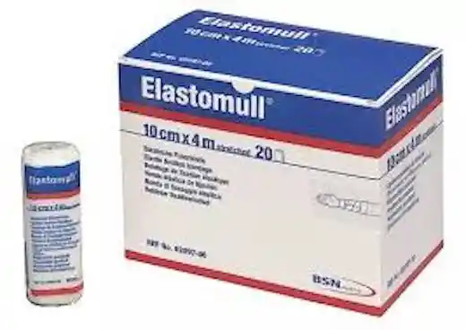 Caja de 20 rollos de vendas elasticadas ideales para fijaciones de apósitos y curaciones. 10 cm x 4 mts.