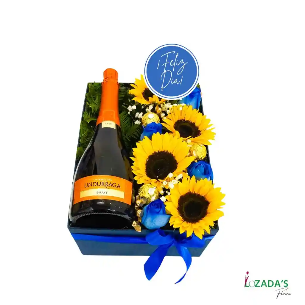 Sorprende a papá con un regalo único que combina elegancia, sabor y naturaleza. Nuestra caja especial para el Día del Padre incluye un espumante Undurraga Brut, ideal para brindar en su honor, acompañado de un vibrante arreglo floral con girasoles, rosas azules y detalles dorados que reflejan admiración, orgullo y agradecimiento. Además, incluye exquisitos chocolates Ferrero Rocher para completar esta experiencia de celebración. 🎁 Un detalle perfecto para demostrarle cuánto lo valoras en su día. 🍾 Exclusivo de Lozada’s Florería – Porque papá merece lo mejor.