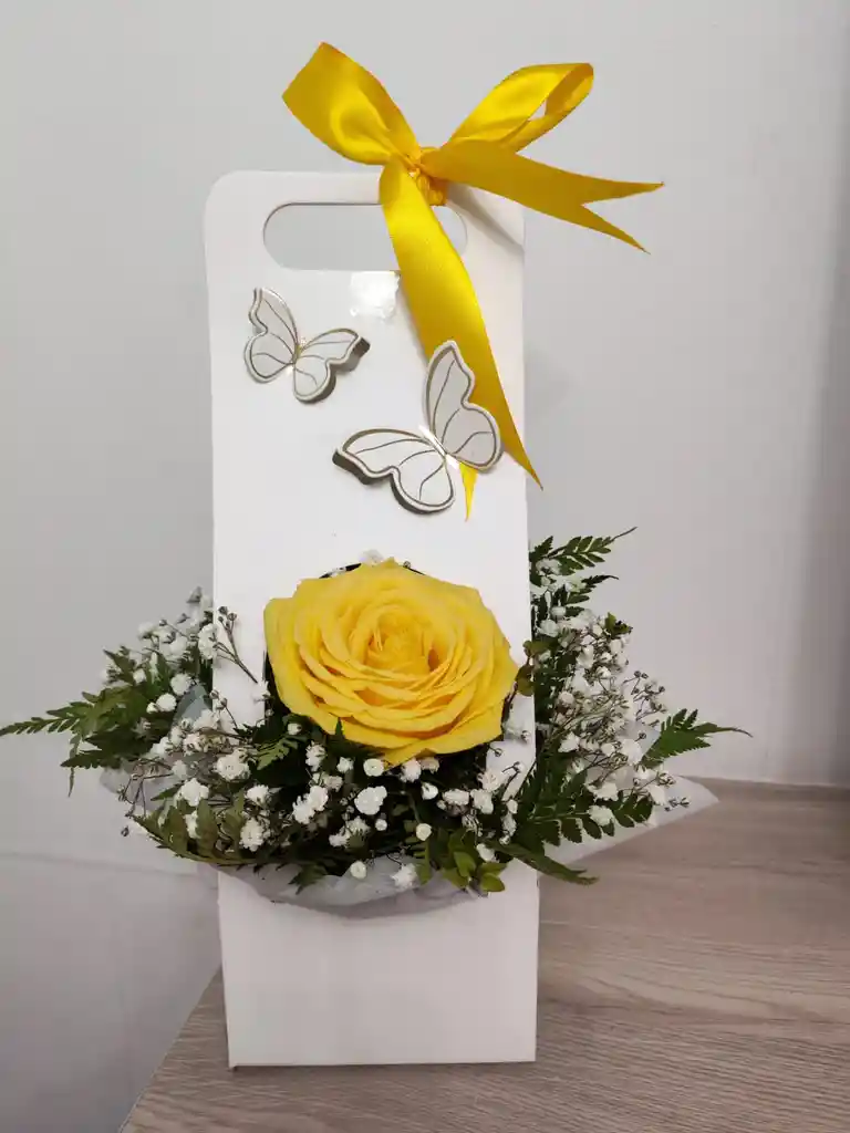Delicado arreglo floral en caja con asa, decorado con una rosa amarilla acompañada de ilusión blanca y follaje verde. Adornado con mariposas en relieve y un elegante moño satinado amarillo. El color de la caja puede variar, según disponibilidad