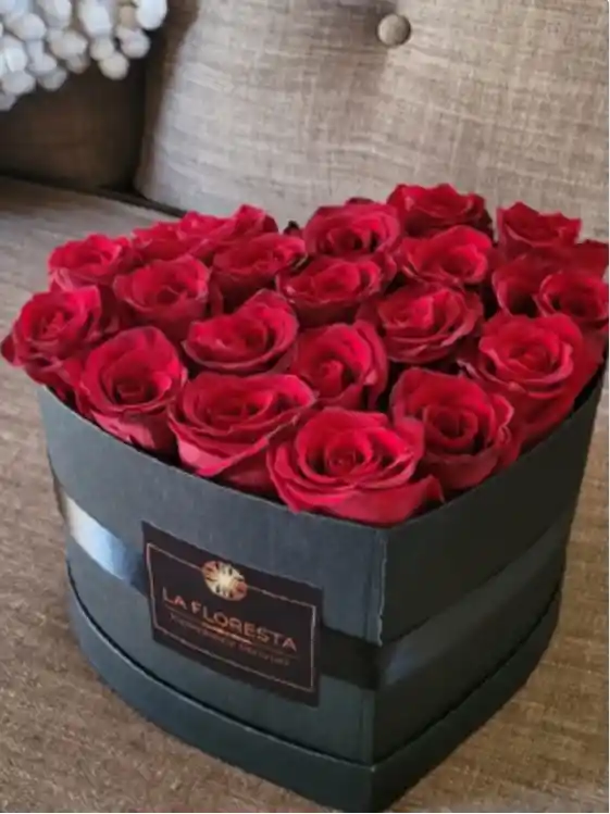 Caja en forma de corazón con 18 rosas. Medidas: 20 x 24 x 15.