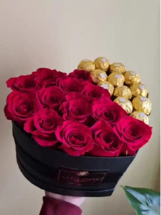 Caja en forma de corazon con 12 rosas más 12 bombones Ferrero Rocher. Medidas: 20 x 24 x 15.