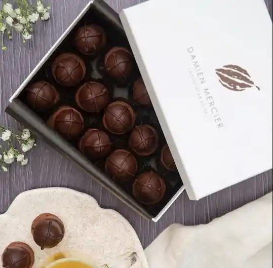 Linda caja de Gâteaux de Chocolat; exquisita trufa sobre brownie de mazapán de almendras, untada en chocolate amargo. Libre de gluten