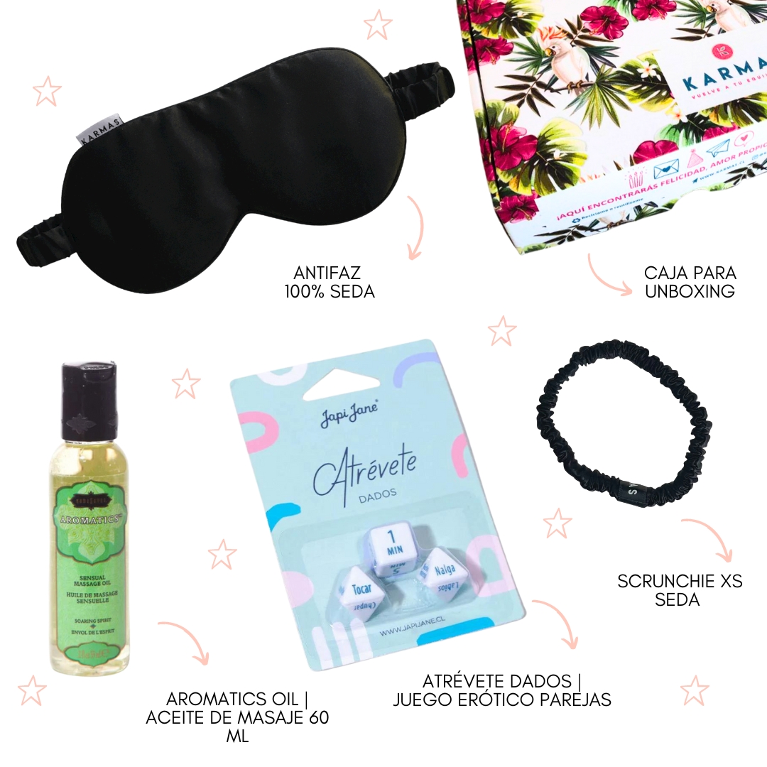 <p>"¡Descubre la experiencia única que te ofrece nuestra caja ""Glamour y Pasión""! Este irresistible kit está diseñado para encender la chispa de la intimidad y añadir un toque de lujo a tus momentos especiales.Perfecto para regalar en una despedida de soltera o simplemente para disfrutar en pareja. ¡Adquiérela y transforma tus noches en recuerdos inolvidables!Haz que cada momento sea especial y lleno de pasión.Encontrarás 5 productos seleccionados con pinzas para despertar sus sentidos, conectar con sus emociones, relajarse y disfrutar. 💚¿Qué incluye?🧡Antifaz de seda negro.🧡Scrunchie de seda XS negro.🧡Aceite para masajes de Aromatics.🧡 Caja reciclable y reutilizable. ¡Para vivir la emoción del unboxing! Un regalo / autoregalo original, lleno de detalles y emoción, para celebrar y quedar como reina/rey con tu regalo.💕 DETALLE DE CADA PRODUCTO💖🧡 Antifaz 100% seda natural 19 mm (Mulberry Silk), certificada por Oeko-Tex Standard 100 de grado superior 6A. Color NegroUn antifaz de seda de alta calidad, suave al tacto y elegante, ideal para una noche de descanso reparador o para agregar un toque de misterio durante juegos íntimos.Medida: 21 x 10,5 cm.Beneficio: La seda natural ayuda a proteger la piel y el cabello, proporcionando una experiencia de descanso de lujo mientras bloquea la luz para un sueño más profundo y reparador.🧡Scrunchie 100% seda natural, delgado, 19 mommes* (Mulberry Silk certificada por Oeko-Tex Standard 100).Perfecto para sujetar el cabello sin dañarlo. La seda es conocida por su suavidad y por evitar las marcas y el frizz.Medida: 8 cms de diámetro aprox y 1 cm de grosor de la tela.Beneficio: Mantén tu peinado elegante y sin esfuerzo mientras proteges tu cabello de tirones y quiebres. Ideal tanto para el uso diario como para ocasiones especiales.🧡Aceite para masajesUn aceite de masajes sedoso y aromático, formulado para suavizar y nutrir la piel mientras relaja los músculos. Es perfecto para un masaje relajante o para agregar un toque sensual a la noche. Sensual mezcla de aceites esenciales de naranja, limón, menta, geranio, jengibre, hinojo y rosa. Contenido de 59 ml. Beneficio: Proporciona una experiencia de masaje de spa en casa, ayudando a liberar tensiones y a conectar más profundamente con tu pareja.🧡Atrévete Dados/ Juego erótico para parejas3 dados diseñados para agregar un toque de diversión y emoción a la intimidad en pareja. Cada cara del dado sugiere una acción, una parte del cuerpo y los minutos, invitando a la creatividad y la conexión.Beneficio: Fomentan la complicidad y la exploración en la relación, proporcionando una manera divertida de descubrir nuevas formas de disfrutar juntos.🧡 Caja reciclable y reutilizable. ¡Para vivir la emoción del unboxing! "</p>