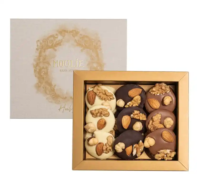 Base de chocolate belga sin azúcar con mix de frutos secos. La caja contiene un surtido de chocolate de leche, blanco y amargo