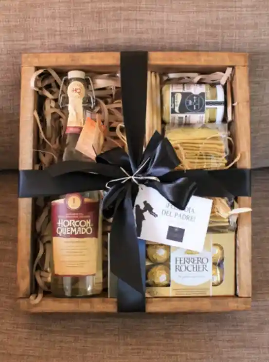 Caja de madera decorada con Pisco Horcón quemado 645ml, Palitos Grissini, Galleta tika - Crakers artesanales, Salsa untable De la casa y Ferrero Rocher de 8 unidades.