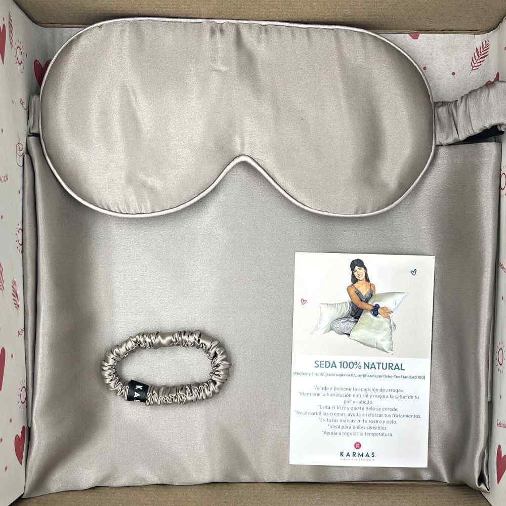 ¡Esta Caja de regalo es para disfrutar de todos los beneficios de la seda!La seda es el mejor secreto de cuidado y belleza! Todos los productos de esta Box son de Seda Mulberry certificada por Oeko-Tex Standard 100. ¿Qué encontraré en esta Caja de regalo?✨Funda almohada de seda doble cara: 100% seda por ambos lados. 19 mommes, tamaño queen (50x75 cms). Blanca✨Antifaz 100% seda gris✨Scrunchie XS 100% seda gris✨Caja reciclable y reutilizable, con un lindo, colorido y alegre diseño sorpresa (la foto es referencial). ¡Ideal para disfrutar tu unboxing al máximo! Preparamos cada producto Karmas en un precioso packaging con cintas de colores y lleno de detalles en su interior, para sorprender a tus más queridos o a ti misma.