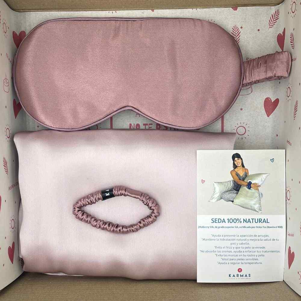 ¡Esta Caja de regalo es para disfrutar de todos los beneficios de la seda!La seda es el mejor secreto de cuidado y belleza! Todos los productos de esta Box son de Seda Mulberry certificada por Oeko-Tex Standard 100. ¿Qué encontraré en esta Caja de regalo?✨Funda almohada de seda doble cara: 100% seda por ambos lados. 19 mommes, tamaño queen (50x75 cms). Blanca✨Antifaz 100% seda palo rsa✨Scrunchie XS 100% seda palo rosa✨Caja reciclable y reutilizable, con un lindo, colorido y alegre diseño sorpresa (la foto es referencial). ¡Ideal para disfrutar tu unboxing al máximo! Preparamos cada producto Karmas en un precioso packaging con cintas de colores y lleno de detalles en su interior, para sorprender a tus más queridos o a ti misma.