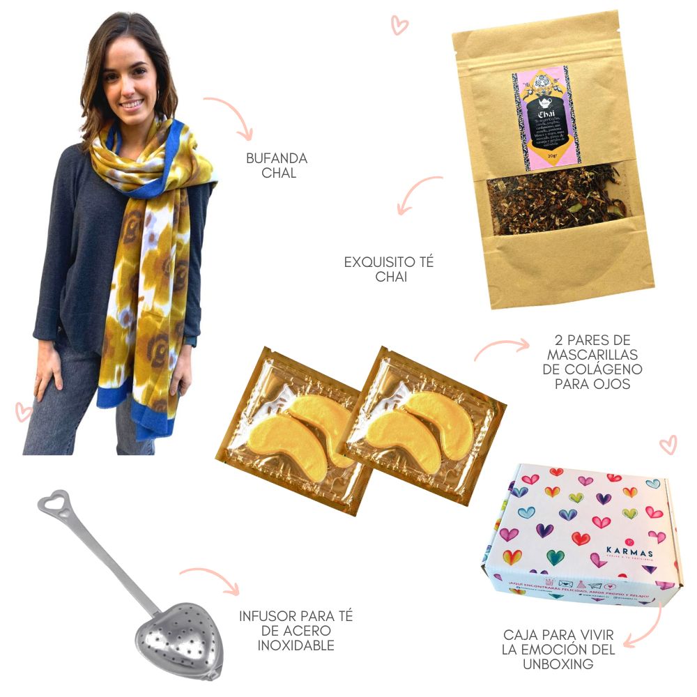 <p>Esta Caja de regalo Invierno Feliz, te ayudar&aacute; a disfrutar, relajarte y vivir este invierno calentita y con la mejor energ&iacute;a.</p> <p>&nbsp;</p> <p>&iquest;Qu&eacute; encontrar&eacute; en esta Caja?</p> <p><strong>⭐ Bufanda chal:&nbsp;</strong>su gran tama&ntilde;o (2,10x70 cms) te permitir&aacute; usarla tambi&eacute;n como manta. De la marca chilena Avidae.&nbsp;</p> <p>Es de textura muy suave y confortable.</p> <p>Medidas: 210 x 70 cms. Materiales: mezcla de viscosa con acr&iacute;lico, de tacto suave y con bordes desflecados.&nbsp;</p> <p><strong>⭐Exquisito t&eacute; Chai,&nbsp;</strong>de la marca chilena Yoyo Tea.</p> <p><strong>⭐ Infusor </strong>dise&ntilde;o coraz&oacute;n para tu t&eacute;, de acero inoxidable.</p> <p><strong>⭐️ Pack 2 pares de Mascarilla de Col&aacute;geno para Ojos.</strong></p> <p><strong>⭐ Caja reciclable y reutilizable</strong>, con un lindo, colorido y alegre dise&ntilde;o. &iexcl;Para disfrutar tu unboxing al m&aacute;ximo!&nbsp;</p> <p>Todo esto te ayudar&aacute; a hacer una pausa, practicar tu amor propio y autocuidado y pensar positivo. Un regalo original y lleno de detalles, para ti misma o para tus m&aacute;s queridas.</p>