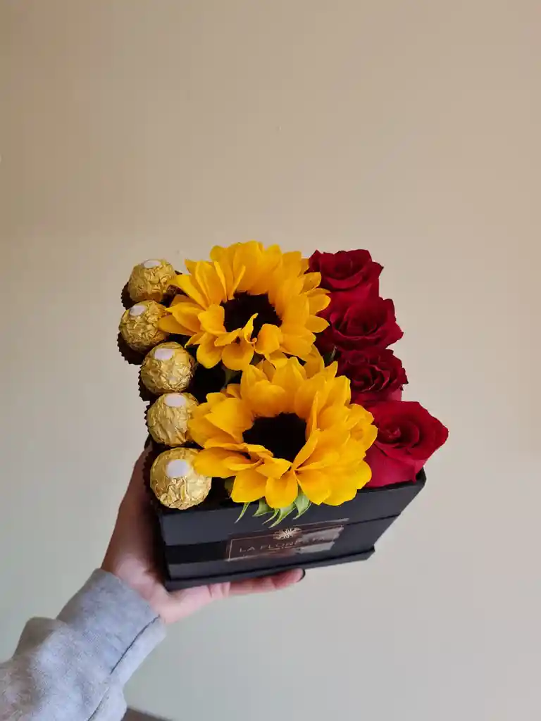 Caja cuadrada con 4 rosas, 2 girasoles y 5 bombones Ferrero Rocher. Medidas: 15 x 15 x 15.