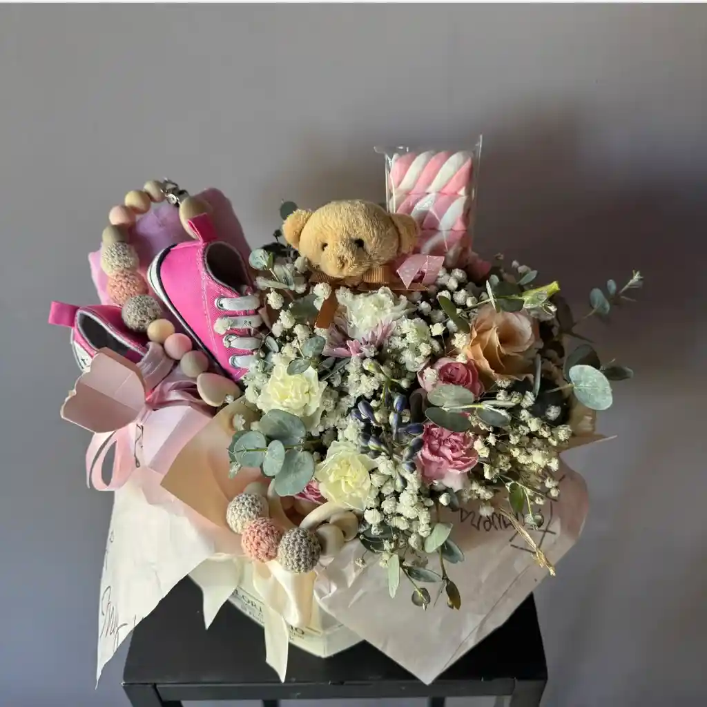 Un lindo conjunto en caja para nacimiento de una niña. Tiene un arreglo floral chico, bombones con guindas bañados en chocolate de leche, un dulce de marshmallow y varios regalitos lindos y útiles para primeros meses de vida del bebé, como: un paño 120xq120 cm de 100% de algodón, primeras zapatillas de tela, 1 sonajero 1 parta chupete y un pequeño osito de peluche. Viene empacada en plástico transparente con una cinta y dedicatoria incluida.