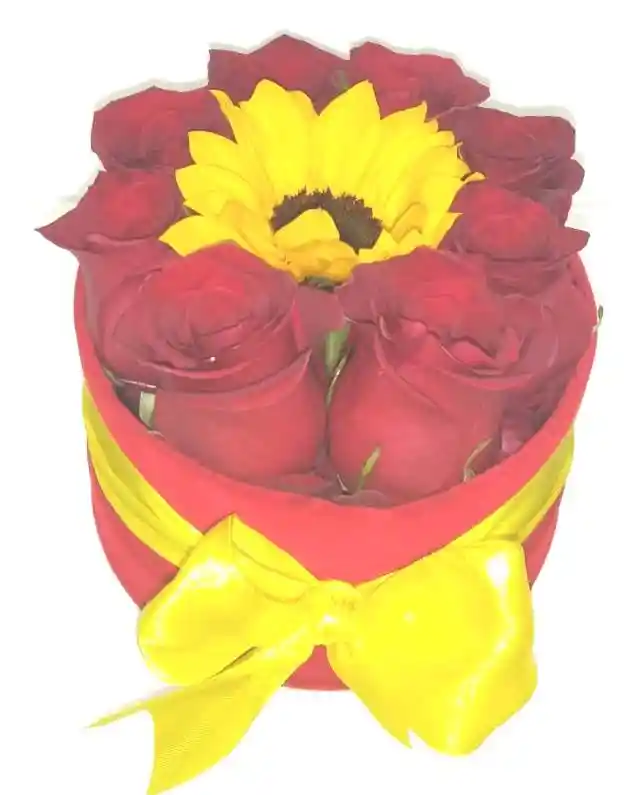 Hermosa caja decorativa en forma redonda con 8 Rosas Importadas y 1 girasol. Diseño de la caja sujeto a disponibilidad.