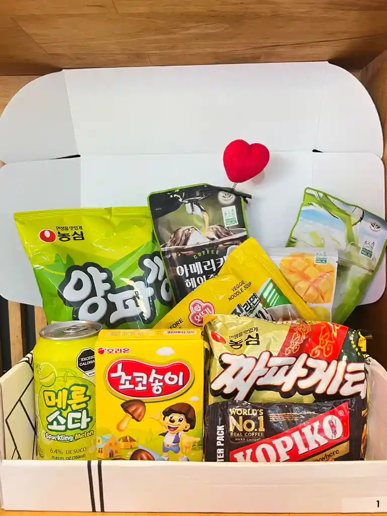 CAJA AMIGO SECRETO 1: JJAPAGUETTI BOLSA x 1 (fideos con salsa agridulce) JIN RAMEN VEGGIE BOLSA x 1 (fideos con sopa de verduras) GALLETAS CHOCOSONGI x 1 (galleta con chocolate) SOUFFLE YANGPAKANG x 1 (snack sabor cebolla) POUCH UVA VERDE x 1 (jugo) POUCH CAFÉ HAZELNUT x1 (cafe de aroma avellanas) POUCH SWEET MANGO x 1,( jugo) BEBIDA MELON SODA x 1 (Gaseosa sabor melon verde) KOPIKO BLISTER DE 8 UNIDS x 1. (caramelos duros de cafe)