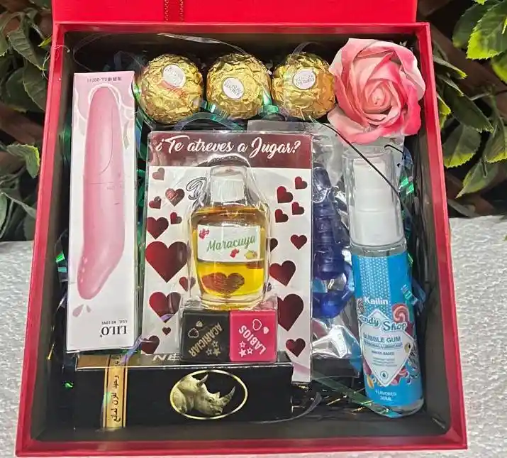 Nuestra caja sorpresa Sex Shop incluye juego de dados con aceite, un vibrador, lubricante, retardante y esta decorado con 3 chocolates Ferrero y una rosa.