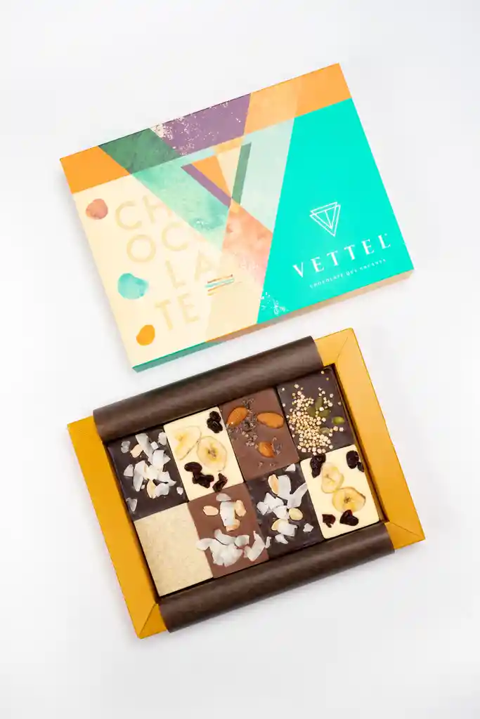Nuestras Tabletas Rústicas nacen de la mano de nuestro Maestro Chocolatero, que busca que las personas puedan experimentar profundamente la intensidad de sabores de nuestro cacao, en llamativos formatos, para que puedas compartir estas 8 piezas con quien tú quieras. Estos sabores son: - Chocolate Blanco 28% Cacao con Zeste Naranja y Café Liofilizado - Chocolate Blanco 28% Cacao con Plátano Chips y Cranberries - Chocolate Leche 35% Cacao con Almendras y Nibs de Cacao - Chocolate Leche 35% Cacao con Maní y Coco - Chocolate Bitter 55% Cacao con Semillas de Zapallo y Quinoa - Chocolate Bitter 55% Cacao con Maní y Coco