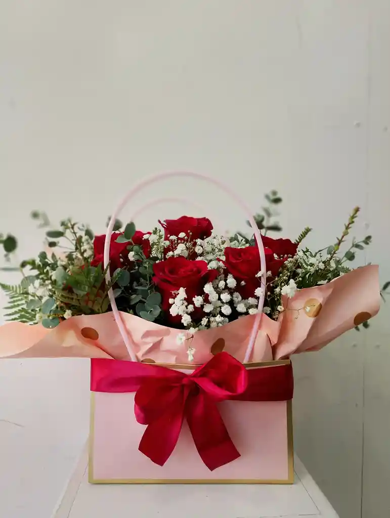Sorprende con este hermoso arreglo en carterita para cumpleaños, aniversario o felicitaciones - 6 Rosas rojas en arreglo - Tarjetita de mensaje