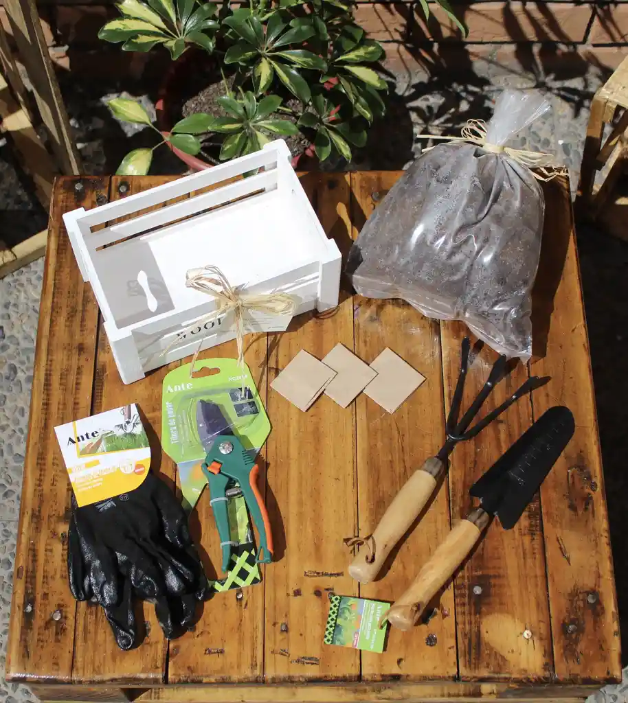 Caja especial para iniciar plantaciones en tu jardín. Contiene: 3 sobres de semillas distintos, pala y rastrillo, tijeras de podar, guantes, tierra de hoja con sustrato y una bella cajita de madera. Ideal para regalo! Pide tu envoltorio de regalo.