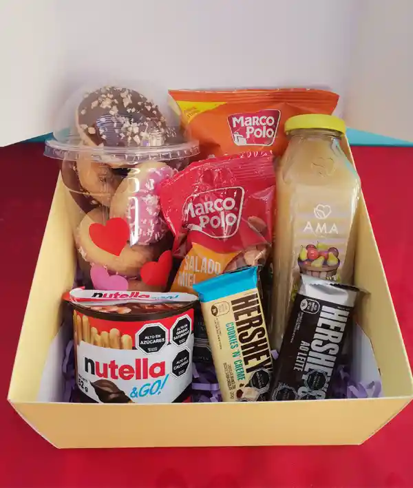 Caja personalizada en su interior: Vaso de 5 mini donuts, jugo Ama Natural, Maní, Ramitas de queso, Nutella Go, 2 Chocolates Hershey.