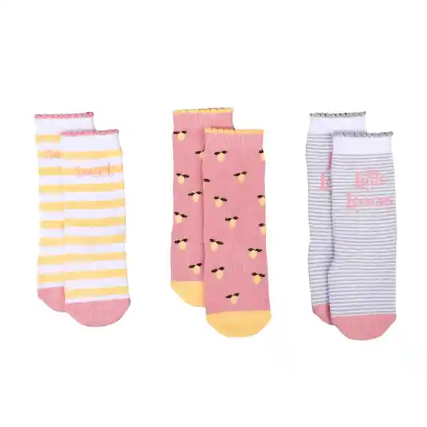 Contiene 3 Pares. Tripack Calcetines Yellow Niña3 Pares de Calcetines Suaves y Cómodos Largos Para Niñas Con Diseños en y Limones en Tonos Amarillo Gris y Rosa. Características: Composición: 80% Algodón 15% Poliéster 5% Elastano. Marca: Infanti. Disponibles en Talla XS (3 6 Meses14 16) (S (6 9 Meses17 19) M (9 12 Meses20 22) y L (1 2 Años23 25). Con Aplicaciones en Brillos y Antiresbalantes..