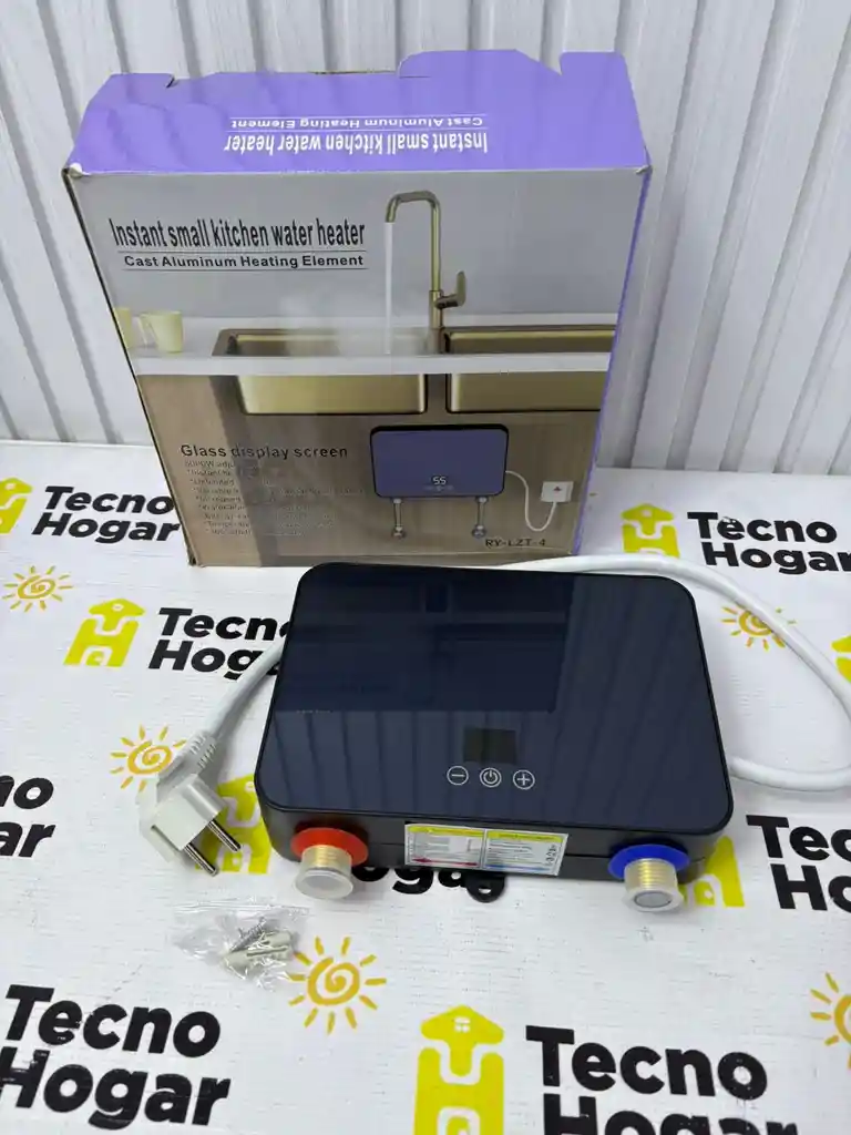 diseñado específicamente para cocinas o lavabos pequeños. Proporciona agua caliente de forma inmediata al abrir la llave, sin necesidad de un tanque de almacenamiento. Cuenta con una pantalla digital que muestra la temperatura del agua en tiempo real. Su diseño compacto y sin tanque permite ahorrar espacio en gabinetes pequeños. El paquete incluye el calentador, tornillos de montaje y componentes para la instalación.