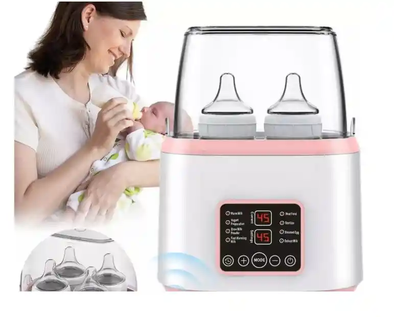1 calentador de biberones. 1 mando a distancia. 1 estante para huevos de vapor. 1 taza medidora. 1 cepillo de limpieza. 1 x pinzas para botellas 1 cepillo de limpieza para pezones. 30 bolsas de leche materna. 1 manual de instrucciones. Calentador de Biberones multifunción 8 en 1: Calentar rápido Calentar leche Alimentos Esterilizar Descongelar Mantener caliente Vaporizar Temporizador e -satisfacer sus necesidades específicas. Desde calentar leche a 40 C hasta descongelar a 35 C, calentar alimentos para bebés a 70 C, esterilizar a 100 C e incluso ajustar la temperatura de la fórmula a 45 C, el calentador de biberones proporciona todas las funciones esenciales que necesita. Además, cuenta con una función de mantener caliente las 24 horas y un temporizador conveniente para mayor comodidad. El mando a distancia de 5 metros incluido garantiza el funcionamiento a distancia. Mantener caliente la leche/comida para bebés en 24 horas --- Con su función de mantener caliente las 24 horas, el esterilizador y secador de biberones asegura que la leche o comida de su bebé permanezca a una temperatura óptima durante todo el día. Dígale adiós a la molestia de recalentar los biberones varias veces al día y disfrute de la comodidad de tener leche caliente o alimentos disponibles cuando su pequeño los necesite. Se adapta a todo tipo de biberones --- Satisfaga sus diversas necesidades: el calentador de biberones portátil está diseñado para acomodar diferentes tipos de biberones, incluidas bolsas de leche materna, biberones de plástico, biberones de silicona, biberones de vidrio e incluso frascos de alimentos. El calentador de biberones para todos los biberones elimina la necesidad de múltiples dispositivos de calentamiento y brinda una solución integral para todos sus requisitos de calentamiento de biberones. Material seguro --- Hecho de material PP apto para uso alimentario, el calentador de biberones para leche materna no contiene BPA, lo que garantiza la seguridad de la comida de su bebé. Puede tener la tranquilidad de saber que cada alimentación está libre de productos químicos y contaminantes nocivos. Lo que obtendrá: el paquete incluye 1 calentador de biberones, 1 control remoto, 1 estante para huevos de vapor, 1 taza medidora, 1 cepillo para limpiar biberones, 1 pinza para biberones, 1 cepillo para limpiar tetinas, 30 bolsas de leche materna y 1 manual de instrucciones. Con este conjunto completo, tiene todo lo que necesita para simplificar la rutina de alimentación de su bebé y garantizar la higiene y la comodidad.