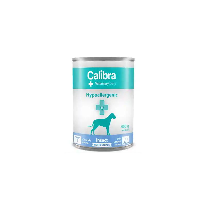 Calibra hypoallergenic Insect rico en salmón es un alimento completo dietético para perros con intolerancias. Composición: 52% insectos, 15% salmón, harina de guisantes, lignocelulosa, aceite de pescado, algas deshidratadas, aceite de linaza, carbonato de calcio, yuca, beta-glucanos, manano-oligosacáridos, fructo-oligosacáridos.
