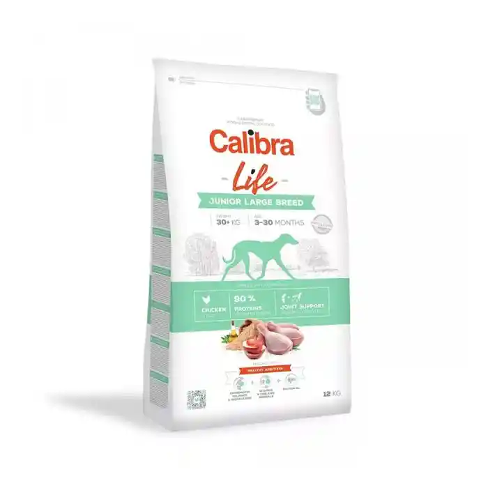 Marca: Calibra Alimento seco para perros Life Junior de razas grandes con pollo Alimento seco superpremium con pollo para perros jóvenes (3-30 meses de edad) de razas grandes (más de 30 kg) Este alimento seco, en el que las proteínas de origen animal constituyen el 90 % del contenido proteico total. Satisface las necesidades para el crecimiento óptimo de las razas grandes y además es hipoalergénico. Este alimento para perros grandes en desarrollo está enriquecido con nutrientes para las articulaciones, que ayudan a los perros a superar los problemas articulares en la edad adulta. Las vitaminas y minerales, además de una dosis de aceite de salmón, también contribuyen al cuidado de la salud general y el sistema inmunitario del perro en edad adulta. Condroprotectores (sulfato de condroitina y glucosamina): nutren el cartílago y retardan el proceso de degeneración. Vitaminas y minerales quelados (formas orgánicas de minerales altamente utilizables) – para el buen funcionamiento del organismo, prevención de enfermedades y fortalecimiento del sistema inmunológico. aceite de salmón Fuente de ácidos grasos omega-3 insaturados (EPA, DHA), necesarios para favorecer las funciones fisiológicas de la piel y el pelaje y mejorar su calidad. Además, posee propiedades antiinflamatorias.