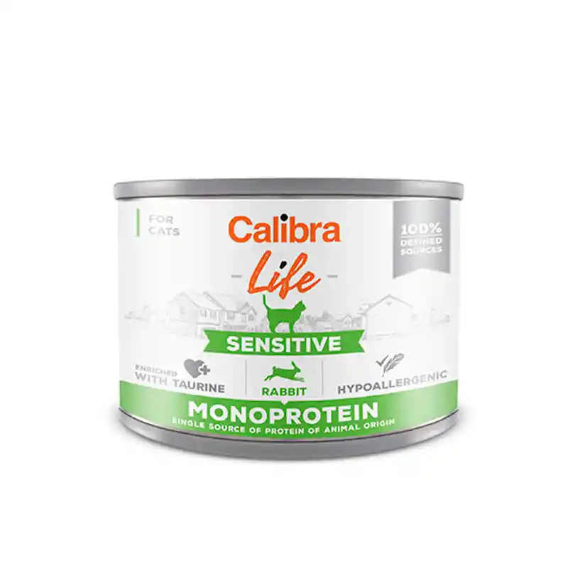 Calibra Life Cat Adulto Sensitive Conejo Lata Comida completa para gatos adultos. • Enriquecida con taurina• Conejo• Hipoalergénica Paquete: 200 g Composición: conejo (70 %), harina de guisantes, aceite de salmón (1 %), lignocelulosa, carbonato de calcio, algas secas (0,2 %, Schizochytrium limacinum). Instrucciones para su uso adecuado: Servir la lata a temperatura ambiente. El tamaño de la ración puede variar dependiendo de la raza del gato y los factores estacionales. Siempre debe haber agua fresca disponible. Componentes analíticos:humedad 78 %proteína bruta 10 %grasa bruta 5,5 %ceniza bruta 1,5 %fibra bruta 0,5 %calcio 0,3 %fósforo 0,25 %sodio 0,25 %ácidos grasos omega 3 0,17 %ácidos grasos omega 6 1,1 % Aditivos nutricionales por kg:vitamina A (3a672a) 800 UIvitamina D3 (3a671)200 UIvitamina E (3a700) 120 mgvitamina B1 (3a821) 1 mgtaurina (3a370) 800 mgbiotina (3a880) 0,4 mgzinc (3b606) 10 mgmanganeso (3b504) 2,4 mgyodo (3b201) 0,6 mgcobre (3b406) 3,2 mghierro (3b106) 8 mg Valor energético metabolizable: 1 055 kcal/kg. Almacenar en un lugar seco y fresco. Después de abrirlo, guardar en el frigorífico y consumir antes de 3 días. La fecha de caducidad, el número de lote y de registro están en la parte inferior de la lata. Fabricado en la UE.