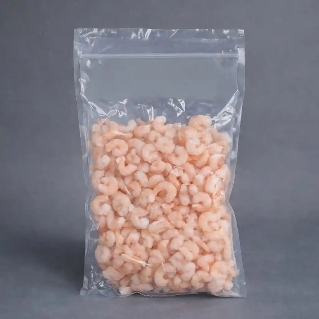 Camarón Ecuatoriano 100-200 (Penaeus vannamei) congelado, IQF. Pelado cocido. Imagen referencial: El empaque del producto puede variar según el stock disponible, manteniendo siempre la calidad que caracteriza a nuestros productos.