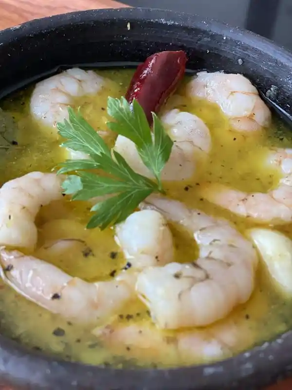 Pocillo de greda con 17 camarones grandes 36/40 al Pil Pil, sellados al vacío. Pre-cocidos congelados. Listo para calentar y servir
