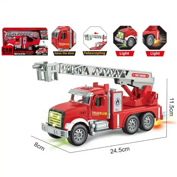 Este camión de bomberos de 25 cm avanza hacia adelante de forma automática. Cuenta con sirena y luces intermitentes de diferentes colores que se activan durante la acción. Al detenerse, su escalera se eleva por sí sola para alcanzar los pisos más altos, y las puertas se abren para una mayor interacción. Una experiencia de juego realista e ideal para pequeños héroes que disfrutan de las aventuras, el trabajo en equipo y los rescates llenos de emoción. Medidas: 28x15cm caja Carga: 3 AA
