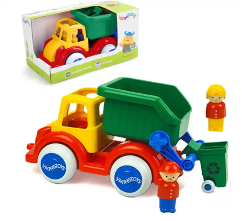 Hermoso camión de basura con dos figuras en la caja de regalo. De material resistente y suave, con colores vivos, para horas de diversión. Irrompible, seguros y de colores fuertes y brillantes. Seguros, suaves, simples, resistentes y silenciosos. Medidas: 28cm.