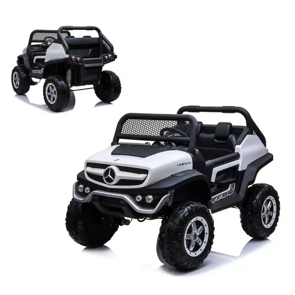 Los más pequeños de la casa podrán dar un paseo lleno de mucha diversión y estilo con esta super fantástica Camioneta a Batería Mercedes Benz Unimog de 12V de 2 Motores con Control Remoto. Te vas a sorprender con los detalles realistas que ofrece este modelo como, luces que se encienden y apagan, MP3, bocina y sonidos de motor que tu hijo podrá activar fácilmente desde el tablero. Incluye un control remoto y cinturón de seguridad para los niños. Este auto es capaz de soportar un máximo de 20 Kg, tiene 2 motores los cuales alcanzan una velocidad de 3 a 9 km/hr, el tiempo de carga es de 12 horas y la batería tiene una duración de 30 a 40 minutos aprox. El producto armado alcanza unas medidas de 108 x 68 x 88 CM.