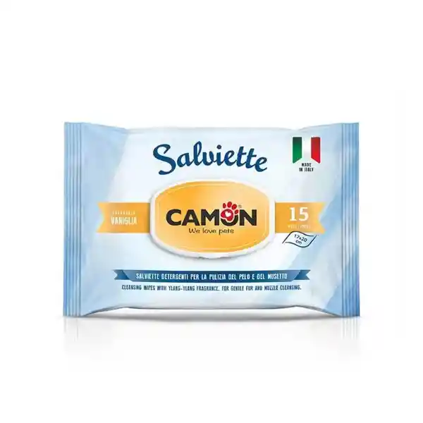 Bolsa Con 15 Unidades. Las Toallitas Húmedas Vainilla Camon Son Ideales Para Mantener la Limpieza de tu Mascota en su Casa o al Salir de Paseo. Su Fórmula Ayuda a Refrescar Nutrir y Proteger el Pelaje de tu Mascota. Recomendadas Para Limpiar el Pelaje Patas Hocico u Orejas de su Perro o su Gato Eliminando el Mal Olor y Dejando un Agradable Aroma. Su Nuevo es Ideal Para Proteger y Mantener Limpia y Con Agradable Aroma a su Mascota en Todo Momento y en Todo Lugar. Presentación de la Toallitas Húmedas Vainilla Camon: 20 x 17 cm. Modo de Uso: Levante la Solapa Adhesiva Retire Una Toallita Pase Suavemente Sobre la Zona de su Mascota a Limpiar y Cierre la Solapa Adhesiva y su Tapa Plástica Para Una Mejor Conservación.