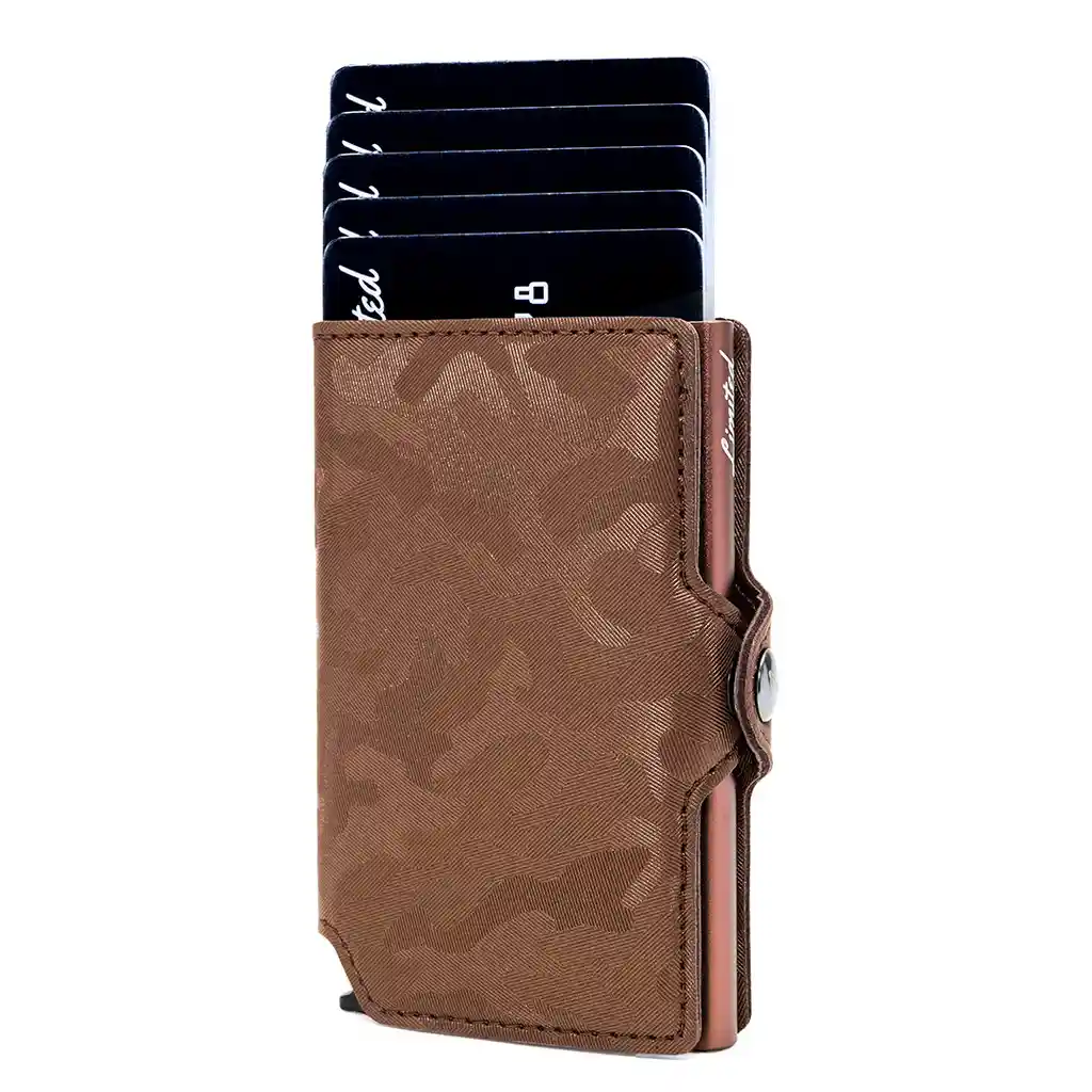 Billetera de cuero PU con tarjetero metálico anti clonación. Hasta 12 tarjetas. 4 tarjetas con relieve o 6 tarjetas lisas en el interior metálico y de 4 a 6 tarjetas en los bolsillos interiores.