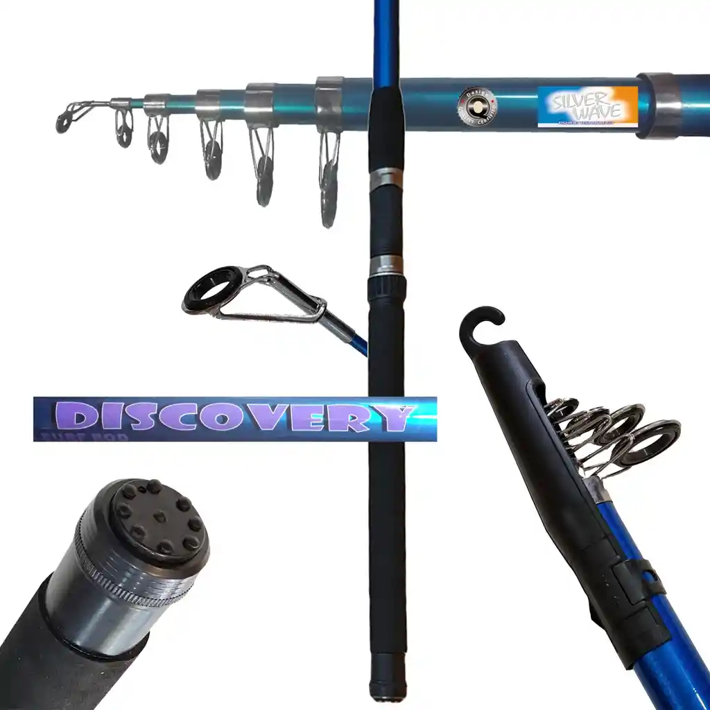 Caña S.WAVE DISC 150-200 3,5 6T Marca Silver Wave Modelo Discovery Tele 3506 – 350 Tipo Caña para pescar Telescópica Destino para Mar y Playa Presas Lenguado y Corvina Largo 3.50 Metros Acción media 150 – 200 Grs Tramos 6 Medida desarmada 90 Cms Peso 390 gramos Material fibra de vidrio + pintura elastica Color Azulino Metálico Brillante Portacarrete Steel-Joint metalico Mango Eva de alta densidad antideslizante Soporte de anillas Aros de acero inoxidables con soldadura por punto Pasadores o Anillas SVEG en teflon 5 Pasadores de doble soporte mas la puntera Pasadores con anillos de teflon para mejor dispersión de calor en el lanzamiento. Indispensables al usar Nylon multifilamentos