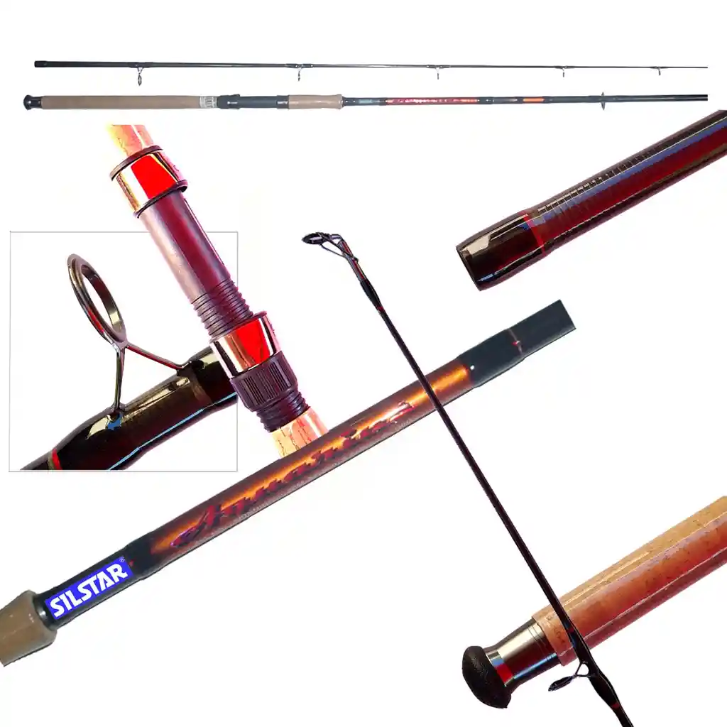 Caña SILSTAR AQUARIUS 2,10 2T Marca Silstar Modelo Aquarius A702 Destino para Rio y Lago Presas Trucha, Salmon y otros Largo 2,10 Metros Acción de punta 40 – 80 Grs Tramos 2 Medida desarmada 108 Cms Peso 215 gramos Material 95% Carbón y 5% fibras cruzadas Color naranja metalico a grafito Portacarrete Sintetico DPS Mango de Corcho con tope de goma 6 pasadores de doble sopotra mas la puntera Pasadores o Anillas Ceramica Utltsg en Arco Curvo de Acero Inoxidable Pasadores con anillos de cerámica para mejor dispersión de calor en el lanzamiento. Indispensables al usar Nylon multifilamentos Presentación en funda negra de dos compartimientos