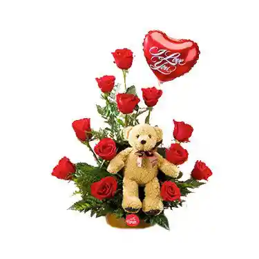 Canasta de 12 Rosas, Peluche 30cm y Globo