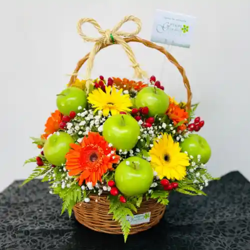 Hermosa canasta decorada con gerberas de varios colores y manzanas verdes.