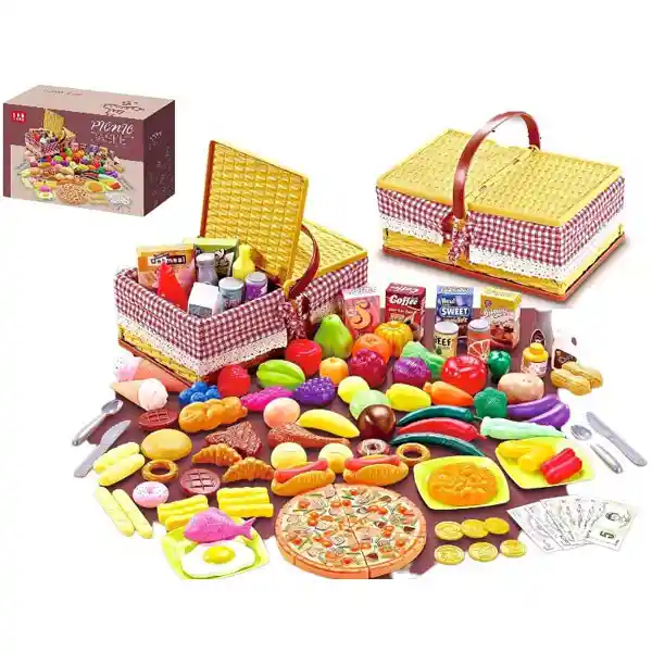Lleva la diversión al aire libre con nuestra cesta de picnic de imitación mimbre! ?? Incluye todo lo necesario: platos, cubiertos, cajitas, frutas, verduras, refrescos y comida rápida. ¡Perfecta para acampar o disfrutar en el jardín, hará que cada picnic sea un festín lleno de diversión! Medidas: 30x20cm caja
