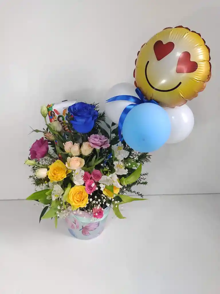 Canasta floral con surtido de 4 flores principales entre rosas, lilium, tulipanes o flores según estación y stock junto a especies verdes y flora decorativa para armar un bello detalle para toda ocasión. acompañado de globo a elección según motivo