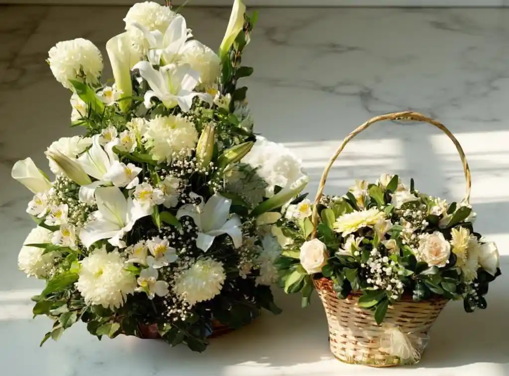 HERMOSA CANASTA Y ARREGLO FLORAL MIX FLORES BLANCAS PARA DESPEDIR A LAS PERSONAS QUE ESTIMAMOS