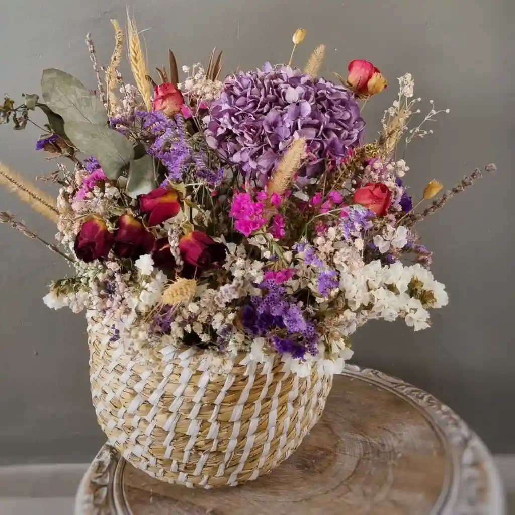 Canasto de fibra natural con arreglo de flores secas en alegres tonos berries (Tonos violeta y rosados). - Tamaño aprox 20 x 30 cms de largo. La imagen es referencial, las flores secas tienen un tono envejecido. Las flores secas duran años! Evita exponer el ramo al sol o tocarlo demasiado. Nuestras flores tienen un protector mate, sin embargo con el paso del tiempo pueden perder color.