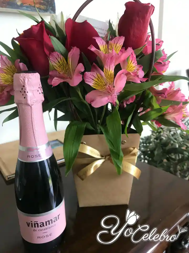 Canasto de Flores y Espumante (colores según disponibilidad) Opcional, tarjeta con mensaje (indíquelo) sin costo adicional. Opcional, cinta de tela grabada con nombre (indique nombre) sin costo adicional.