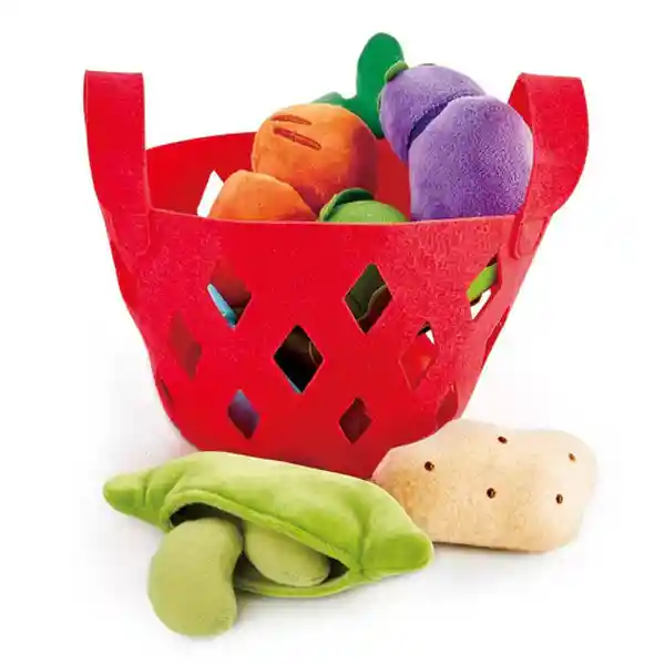 Canasta de fieltro suave con seis de tus verduras favoritas. Edad: +18 meses