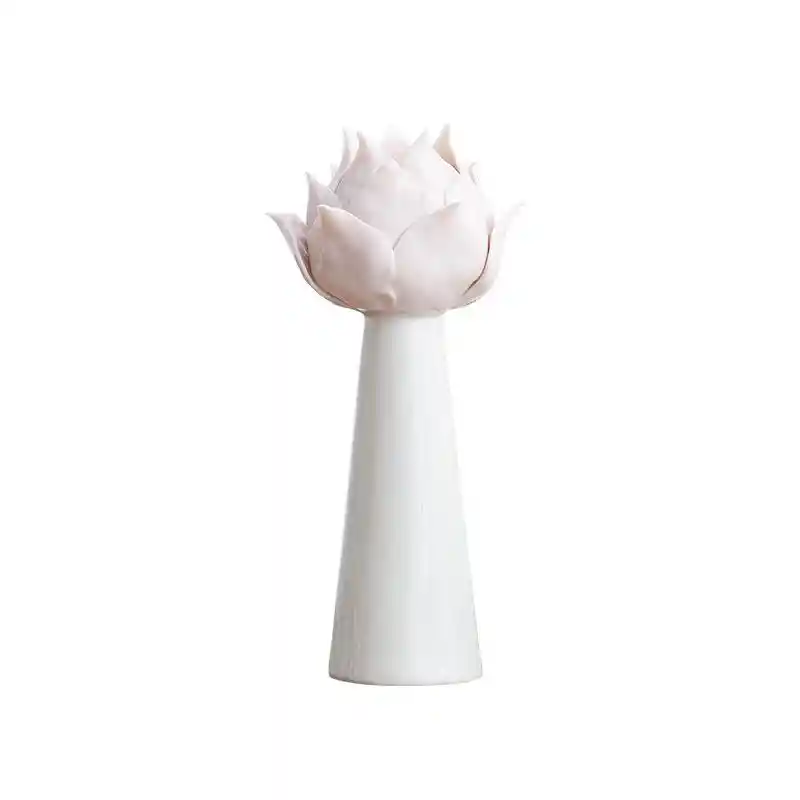 Esta delicada figura de porcelana, es un hermoso candelabro que imita la delicada flor de la peonía. Es parte de nuestro juego de té de rosas. Es de color blanco con acabado brillante y moldeada a mano en finísima porcelana. De ahí su liviano peso. Se debe tratar con cuidado y admiración. Lo puedes combinar con las demás piezas del juego de té de rosas. Su textura, capas y pálido color rosado, lo hacen un gran centro de mesa y es fácil de combinar. Le dará un toque increíble a tu mesa, o donde quieras colocarlo.