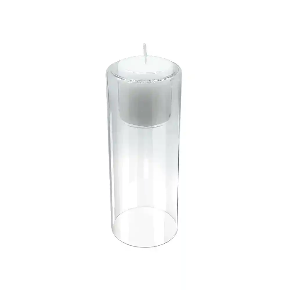 Portavela de vidrio de 7,5 cm de diametro y 20 cm de alto. Vela indicada para usar en su interior: Vela para candelabro. Colocar sobre una superficie plana.