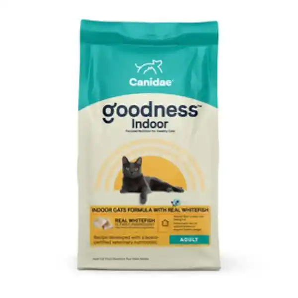 For Indoor Adulto de Interior. Canidae Goodness es un Alimento Seco Formulado Específicamente Para Mantener Saludables a Los Gatos Adultos de Interior y Proporcionarles Una Dieta Deliciosa y Nutritiva. Un Alimento Rico en Proteínas Desarrollado en Colaboración de Nutricionistas Veterinarios Certificados Con Ingredientes Científicamente Probados Para Proporcionar Una Nutrición Específica y Ayudarle a Mantener un Peso Saludable. Nuestra Fórmula Para Gatos de Interior Contiene Pescado Blanco Como Primer Ingrediente y es Rica en Fibra Natural Para Ayudar a Que Los Gatos se Sientan Saciados. Canidae Goodness Indoor es Alimento Seco Con Una Fórmula Específica Para Gatos de Interior. Con Garbanzos y la Linaza Que Ayudan a Los Gatos a Sentirse Llenos y Favorecen la Salud Digestiva. Una Receta Desarrollada Por Veterinarios Nutricionistas Con Ingredientes Limitados y Enlistados. Fórmula Con Antioxidantes y Probióticos Que Favorecen Salud Inmunitaria y Del Sistema Digestivo. Contiene Vitaminas y Minerales Que Contribuyen a la Salud de Articulaciones la Piel y el Pelaje.