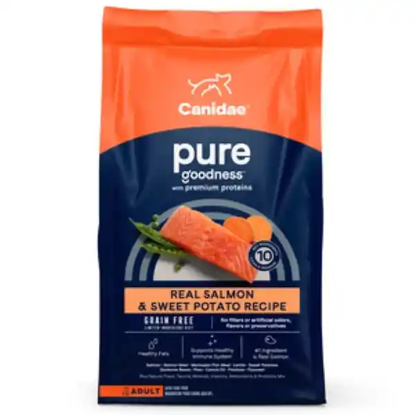 Natural Sin Granos. Canidae Pure Salmón y Camote es Alimento Seco Natural Libre de Granos Diseñado Para Cubrir Los Requerimientos Nutricionales de Los Perros Adultos Con la Combinación Ideal de Proteínas Premium y Ácidos Grasos Esenciales en Una Genial Receta Con 10 Ingredientes Clave. Mantén Sus Articulaciones Saludables Con la Glucosamina y Condroitina Adicionada en su Fórmula y Una Piel y Pelaje Hermoso Con Sus Ácidos Grasos Esenciales al Tiempo Que Sus Antioxidantes y Sus Eficaces Probióticos Colaboran Para Mantener en Óptimo Nivel su Sistema Inmune y Salud Digestiva su Salud Cardiaca se Prioriza Gracias a la Adición de Taurina. Canidae Pure es Alimento Seco Natural Libre de Granos Para Perro Adulto Receta Salmón y Camote. Todas Las Bondades de Proteína Premium en Una Receta Libre de Granos Sin Ingredientes Relleno. Con un Nivel Garantizado de Probióticos(Con Cepas de Alta Eficacia) Que Apoyan la Salud Digestiva. Nivel Adecuado de Tocoferoles Mixtos Para Mantener la Estabilidad y la Calidad de Las Croquetas. Nivel Optimizado de Vitaminas y Minerales Ofreciendo Mayores Niveles de Nutrientes Esenciales. Todas Las Fórmulas de Canidae Pure Exceden Los Requisitos de AAfco y Los Altos Estándares Pure.