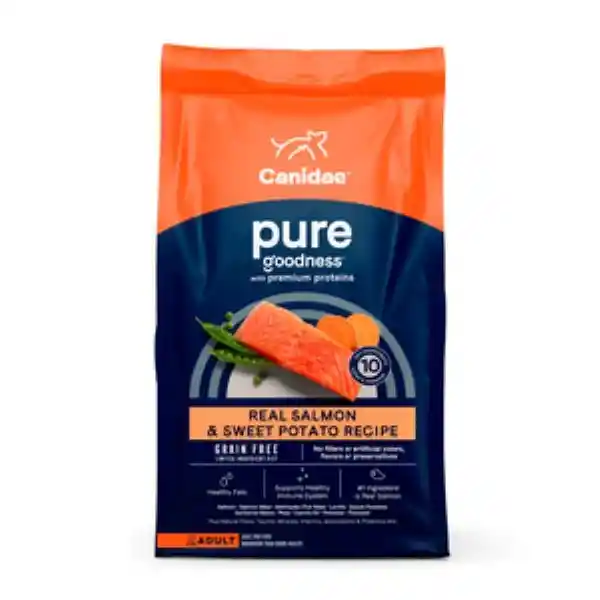 Natural Sin Granos. Canidae Pure Salmón y Camote es Alimento Seco Natural Libre de Granos Diseñado Para Cubrir Los Requerimientos Nutricionales de Los Perros Adultos Con la Combinación Ideal de Proteínas Premium y Ácidos Grasos Esenciales en Una Genial Receta Con 10 Ingredientes Clave. Mantén Sus Articulaciones Saludables Con la Glucosamina y Condroitina Adicionada en su Fórmula y Una Piel y Pelaje Hermoso Con Sus Ácidos Grasos Esenciales al Tiempo Que Sus Antioxidantes y Sus Eficaces Probióticos Colaboran Para Mantener en Óptimo Nivel su Sistema Inmune y Salud Digestiva su Salud Cardiaca se Prioriza Gracias a la Adición de Taurina. Canidae Pure es Alimento Seco Natural Libre de Granos Para Perro Adulto Receta Salmón y Camote. Todas Las Bondades de Proteína Premium en Una Receta Libre de Granos Sin Ingredientes Relleno. Con un Nivel Garantizado de Probióticos(Con Cepas de Alta Eficacia) Que Apoyan la Salud Digestiva. Nivel Adecuado de Tocoferoles Mixtos Para Mantener la Estabilidad y la Calidad de Las Croquetas. Nivel Optimizado de Vitaminas y Minerales Ofreciendo Mayores Niveles de Nutrientes Esenciales. Todas Las Fórmulas de Canidae Pure Exceden Los Requisitos de AAfco y Los Altos Estándares Pure.