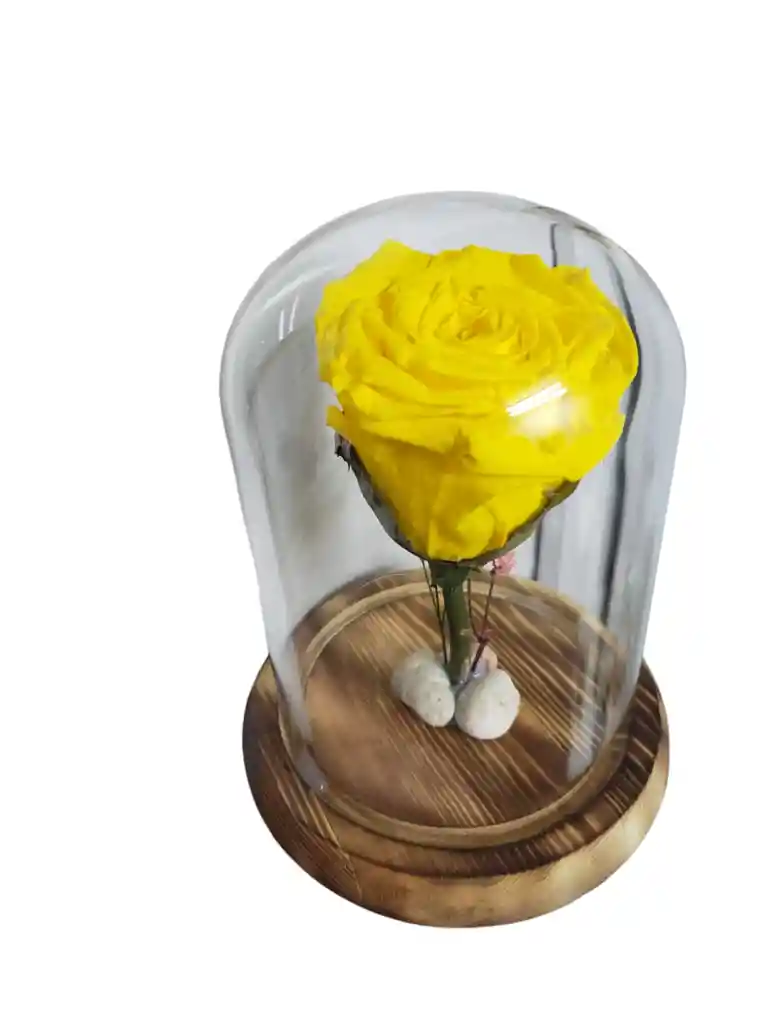 Capsula de vidrio con rosa preservada color Amarillo, tamaño 15cm de alto por 11cm de ancho, viene en caja para regalo con instrucciones de cuidado. Las Rosas preservadas son rosas naturales que vienen desde ecuador en donde después de ser cosechadas pasan por un proceso de liofilización que les permiten estar vivas durante 5 años o más. Somos importadores directos.